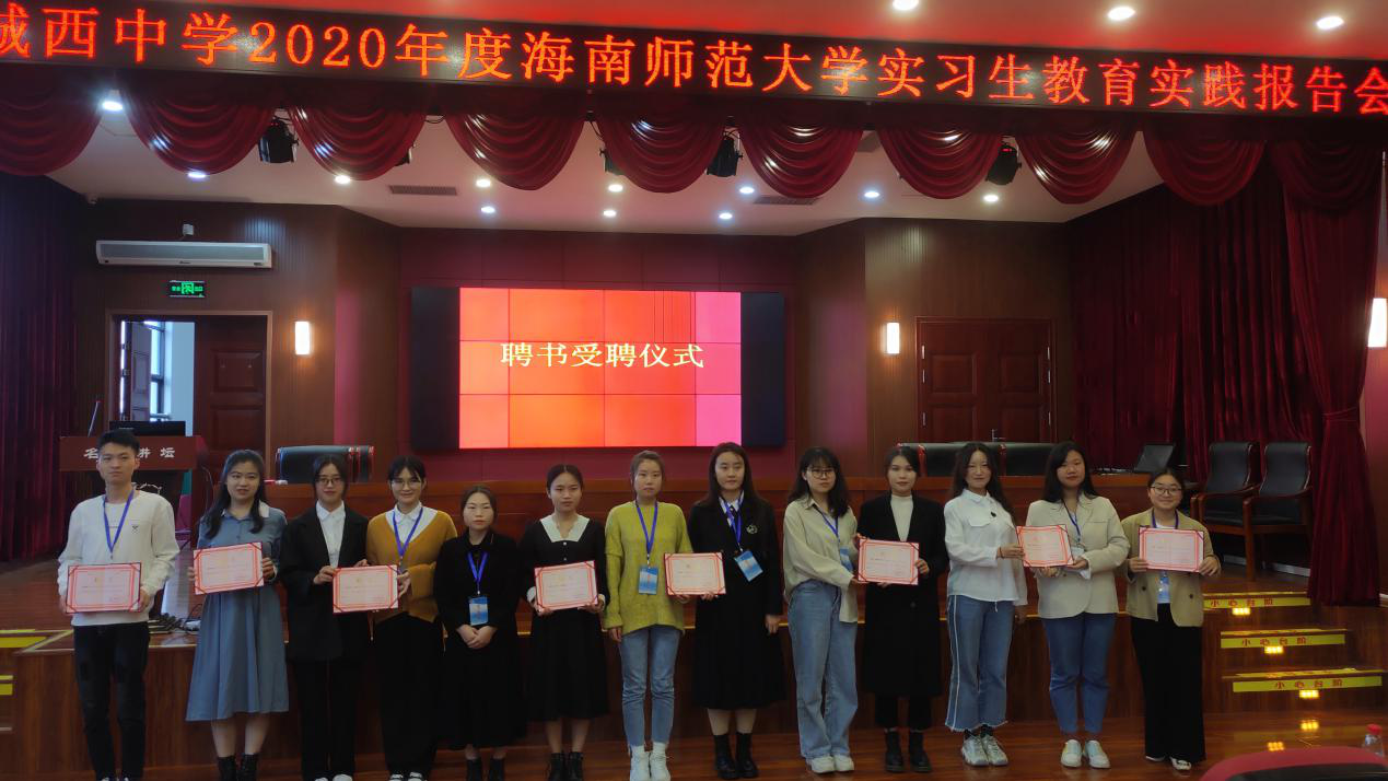 12 月7日下午,为了考察我院15名本科实习生在海口市城西中学近两个月实习的具体成效,城西中学实习小组在城西中学南楼5楼报告厅开展了实习总结汇报。海口市城西中学陈日果校长、学院思政系主任董前程、团委书记陈霆以及城西中学政治学科组的各位实习指导老师参加了此次总结汇报会。