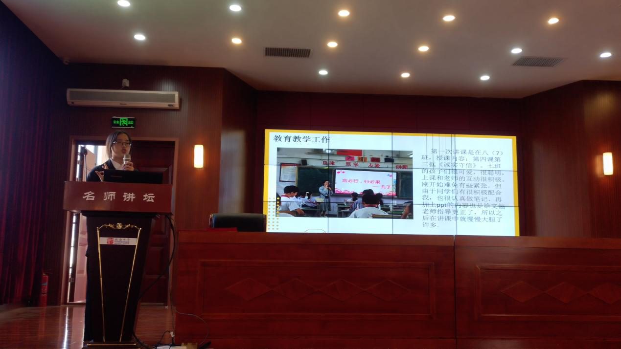 总结汇报分为个人进行实习总结汇报、指导师点评、颁发指导教师聘书和实习生实习证书、实习生和指导老师合影留念四个环节。下午三点总结汇报会准时开始,实习小组各同学依次进行了10分钟左右的总结汇报,汇报内容大体分为教育教学工作展示、班主任工作展示、教育收获和教育反思四个环节。每一组汇报结束之后,由指导老师对实习生汇报总结进行一一指导和点评,并解答实习生提出的教学困惑。最后,实习小组每一位同学都对城西中学的领导和指导老师表达了诚挚的感谢。