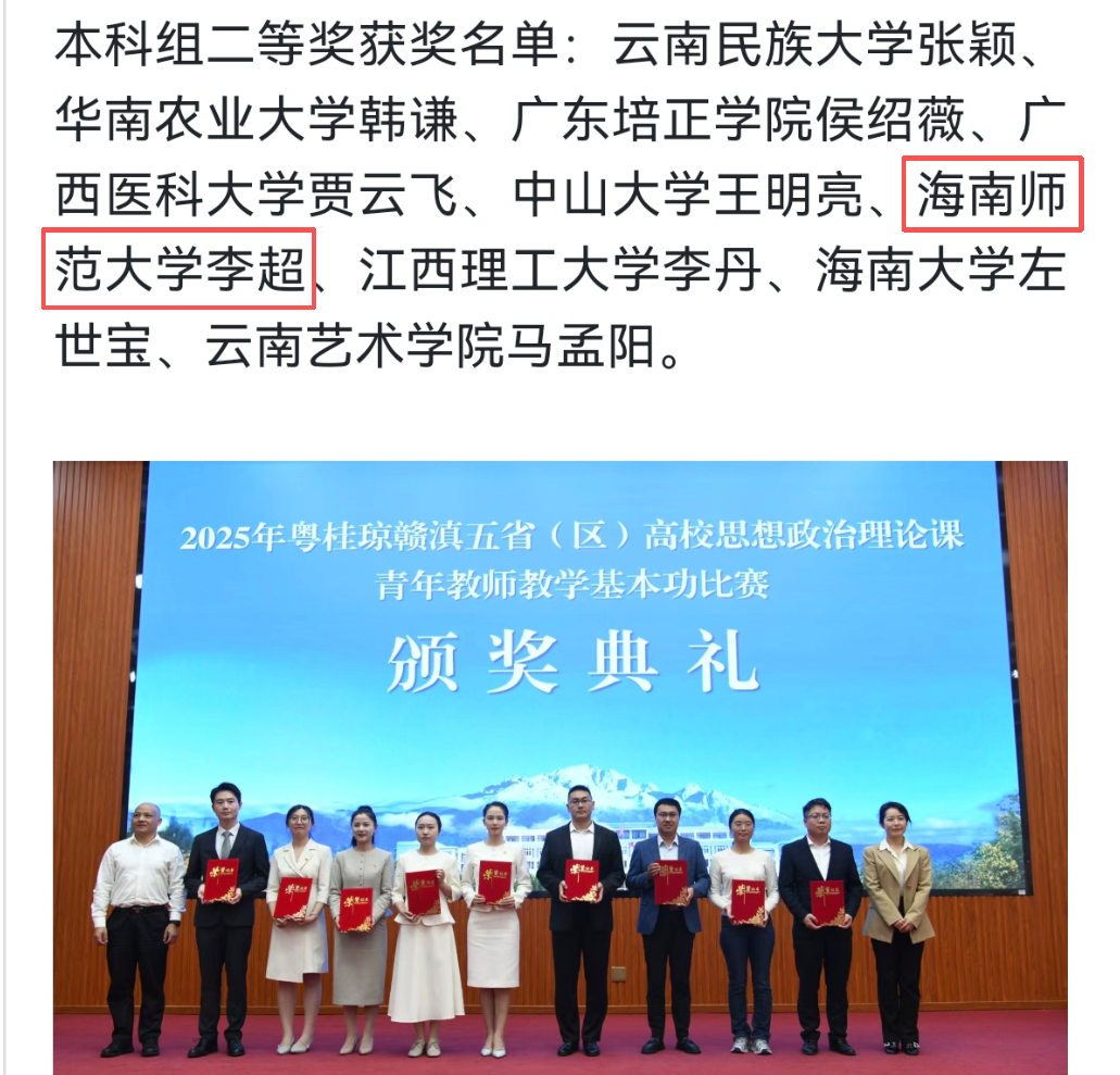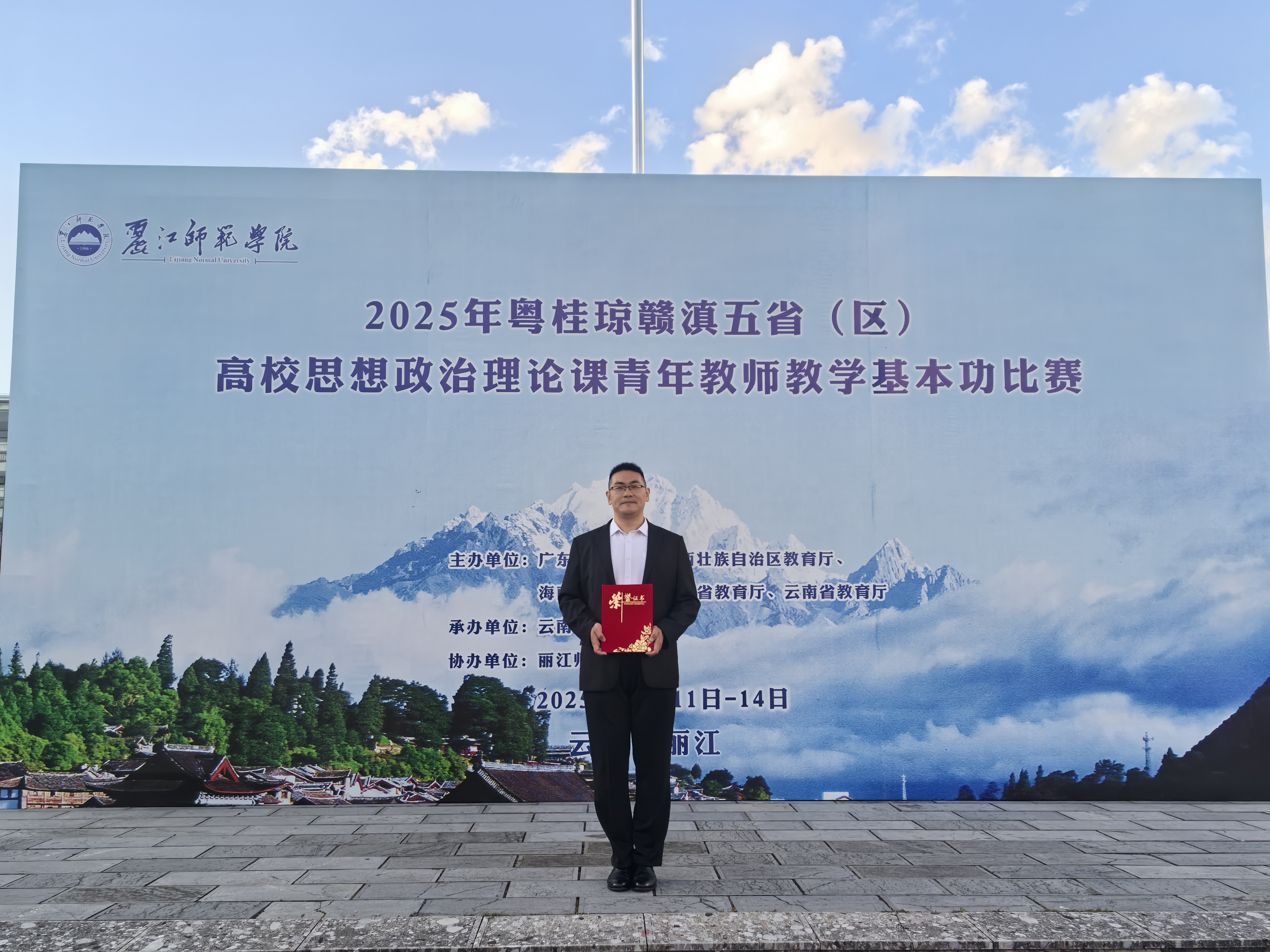 2025年10月11日至13日,2025年粤桂琼赣滇五省(区)高校思想政治理论课青年教师教学基本功比赛在云南省丽江市举行。此次比赛分设本科组和高职高专组进行,来自广东省、广西壮族自治区、江西省、云南省、海南省的40名高校青年思政课教师参赛,200多名教师观摩比赛。我院教师李超代表海南省《中国近现代史纲要》课程科目参加本科组比赛。七位评委对参赛选手的教学设计、教学态度、教学内容、教学方法、教学效果等指标进行综合评分。经过为期两天的激烈角逐,我院教师李超荣获本科组二等奖。