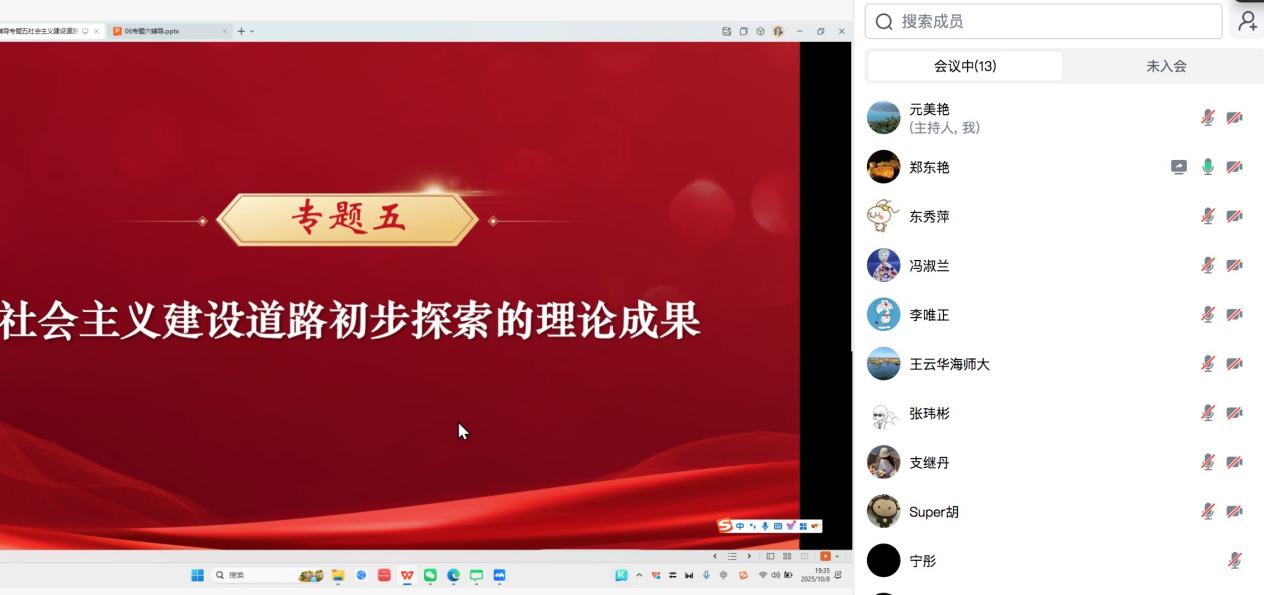2025年10月8日晚,“毛泽东思想和中国特色社会主义理论体系概论”教研室召开2025年第八次集体备课会,围绕第四章和第五章教学内容开展集体备课。教研室全体专兼职老师参会。
