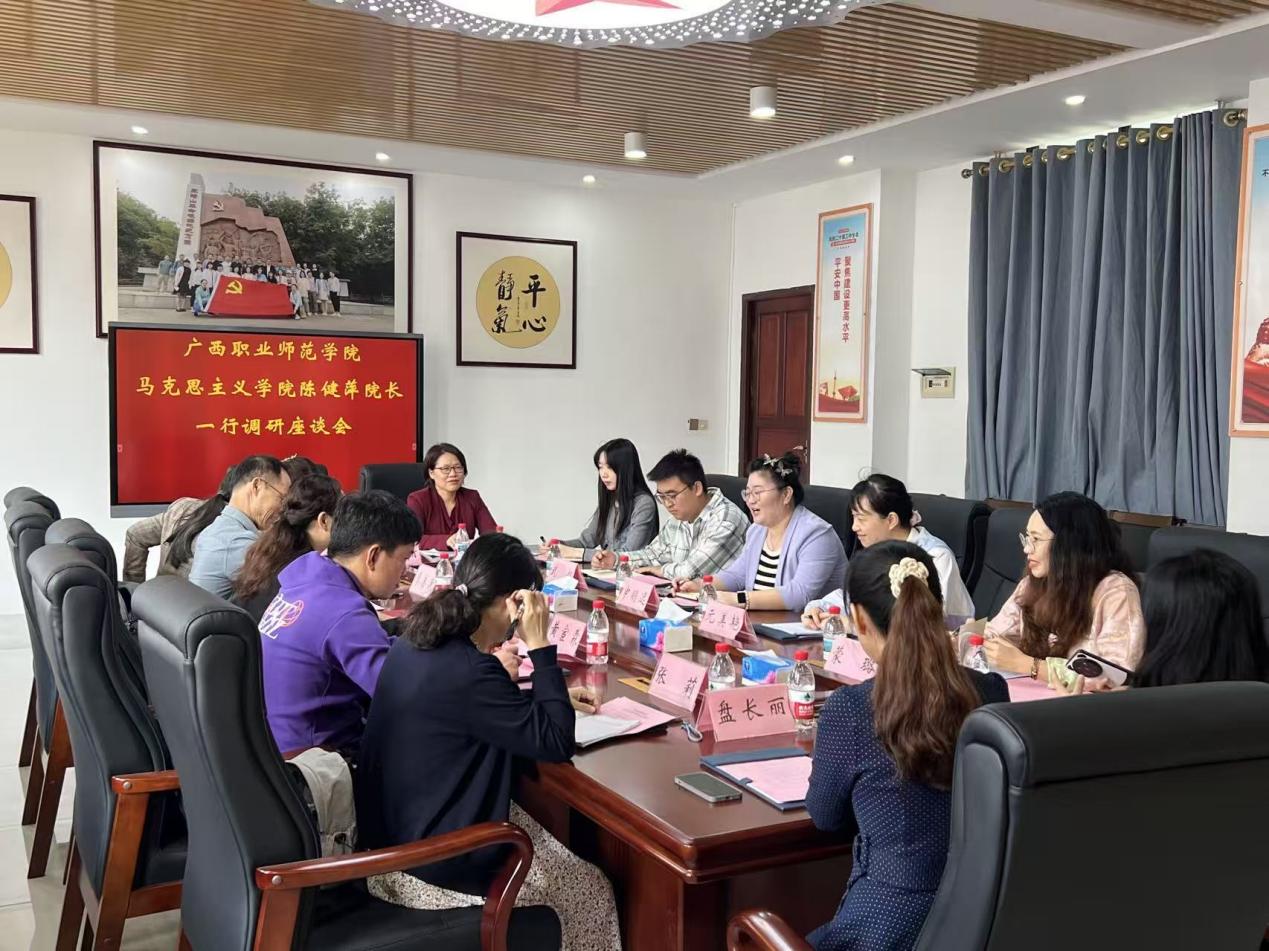 11月14日上午,为深化马克思主义理论学科建设,加强校际思政教育交流合作,广西职业师范学院马克思主义学院一行在陈健萍院长的带领下到我院调研座谈,学院副院长申明远、概论教研室主任元美艳、纲要教研室教师武超参加座谈。