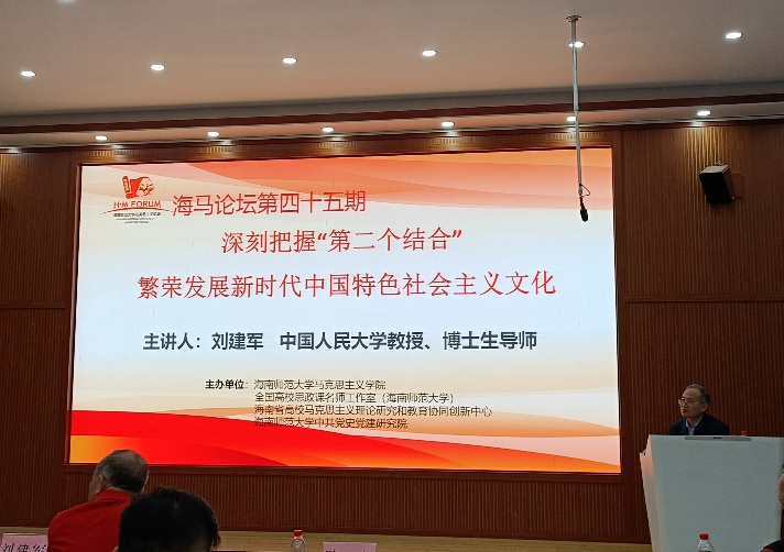 2025年11月29日下午,应海南师范大学马克思主义学院邀请,中国人民大学马克思主义学院二级教授、中央实施马克思主义理论研究和建设工程首席专家、“万人工程”哲学社会科学领军人才入选者、教育部“长江学者”特聘教授刘建军,在马克思主义学院201报告厅作了题为《深刻把握“第二个结合”繁荣发展新时代中国特色社会主义文化》的学术讲座。学院百余名师生参会,讲座由马克思主义学院院长、博士生导师陈红主持。