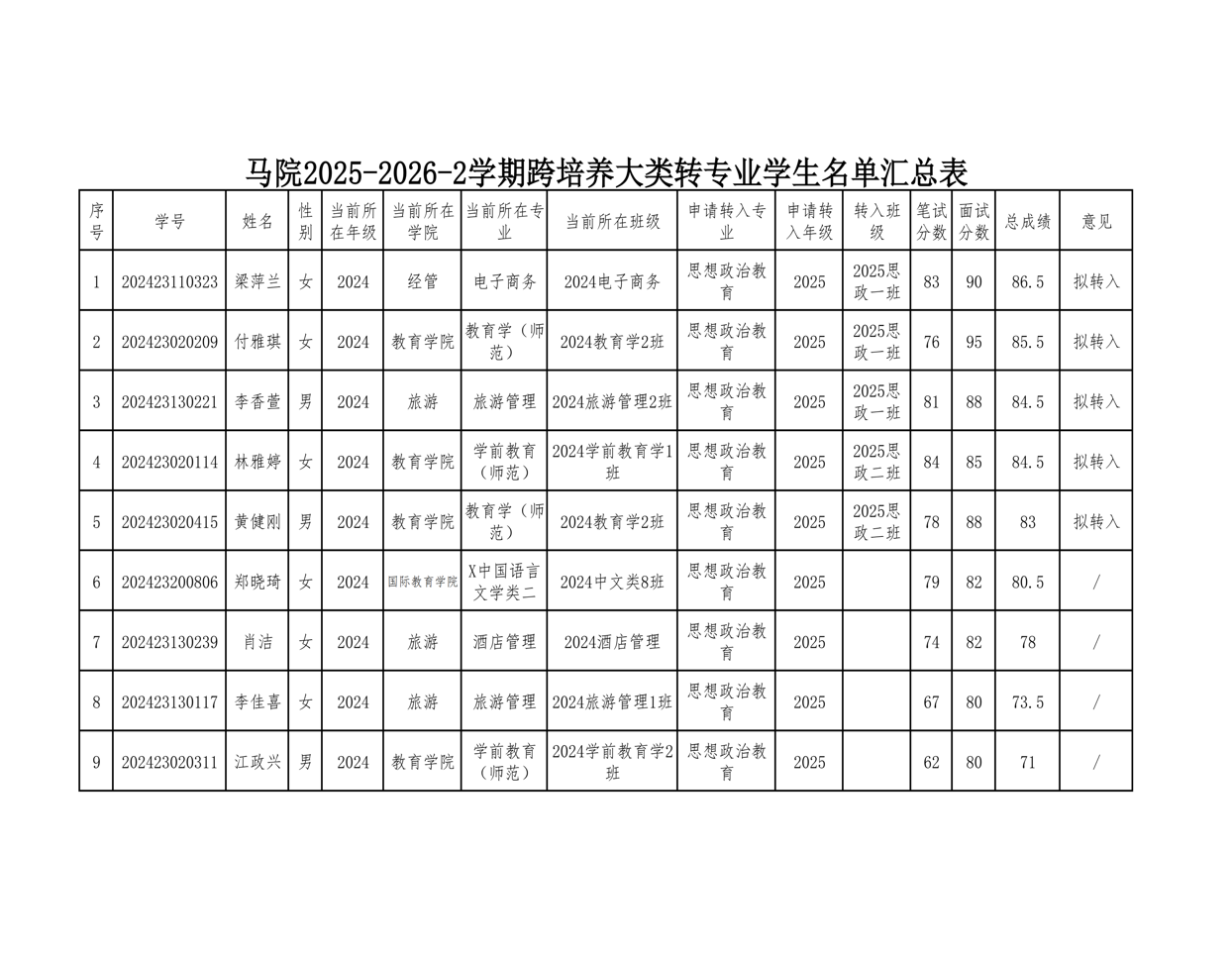 根据《海南师范大学本科生转专业管理办法》、《关于做好2025—2026学年第二学期学生转专业工作的通知》和《马克思主义学院关于做好2025—2026学年第二学期学生转专业的工作方案》的有关要求,学院共收到9人转专业申请。