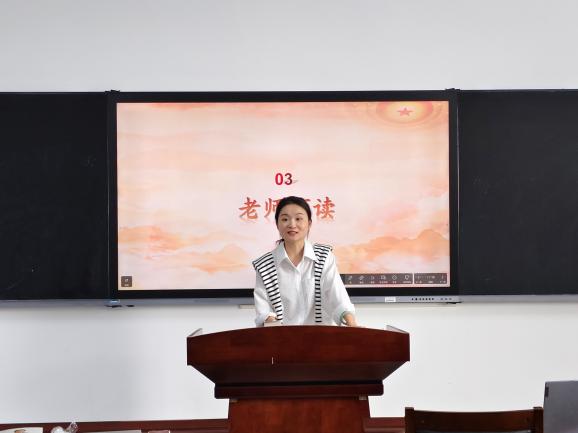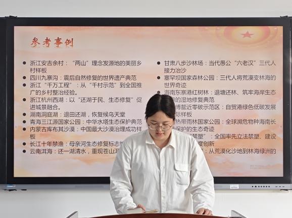 领读环节中,葛士华老师结合自身研究积淀与经典著作研读经验,为同学们开展领学导读。她重点解读了“全面推进美丽中国建设”中的四篇选读篇目,清晰梳理了各篇目在生态文明建设中的侧重点与核心要点,深入阐释了这些论述背后的实践逻辑与时代意义,指出其为新时代生态文明建设提供了鲜活实践样本和科学行动指南。最后,葛老师动员全体同学,要将理论学习与实践行动相结合,主动践行习近平生态文明思想,争做生态保护的参与者、推动者。