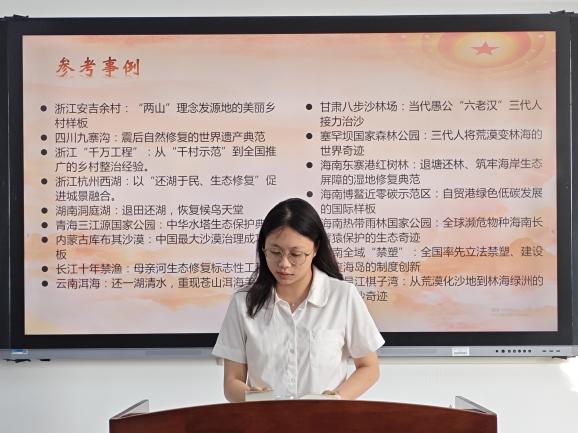 活动伊始,全体成员共同观看生态文明建设主题时政专题视频,直观感受“绿水青山就是金山银山”发展理念在全国各地的生动实践与丰硕成果,直观领略生态保护与经济发展协同推进的现实图景,为后续的文本精读和深度研讨筑牢思想基础、做好充分铺垫。随后,同学们聚焦《习近平谈治国理政》第五卷中关于生态文明建设的重要论述,围绕人与自然和谐共生、美丽中国建设、生态保护与经济发展协同推进等核心主题,逐字逐句开展文本精读,深入剖析理论内涵,进一步夯实了生态文明建设的理论根基,深化了对习近平生态文明思想时代价值的理解。