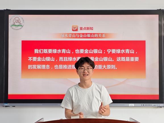 在“理论+时事案例”对话分享环节,同学们紧扣精读篇目核心内容,结合自身所学与所见所闻,分享实践案例、交流学习感悟,实现了理论与实践的深度碰撞。叶晨琳同学以内蒙古库布其沙漠治理为案例,详细介绍当地通过筑牢锁边林、发展光伏治沙等模式,依托地域特色实现生态修复与经济效益的双向共赢,让“沙进人退”转变为“绿进沙退”,印证了习近平生态文明思想的实践伟力;钟逸飞同学结合浙江生态保护实践,分享了当地践行“两山”理念、推进“千万工程”,实现生态美、经济强、百姓富的发展路径,深入剖析了经济发展与生态保护的辩证统一关系,强调要实现生态效益、经济效益与社会效益的有机统一。其他同学也相继分享了各地生态保护时事案例,在交流探讨中进一步深化了对习近平生态文明思想的理解与把握。