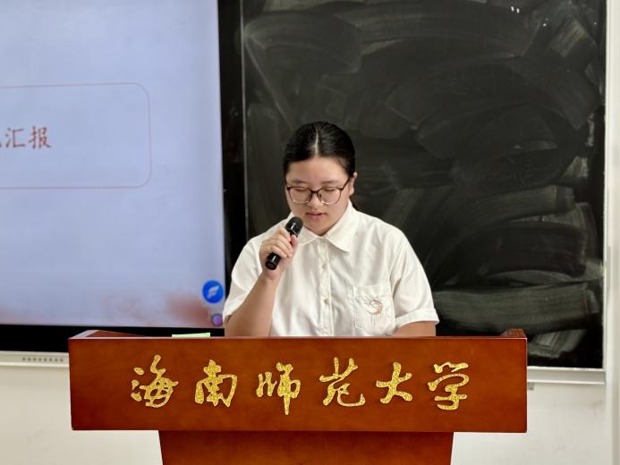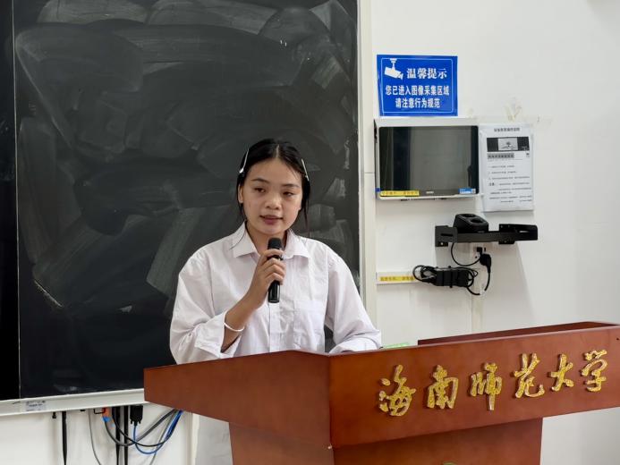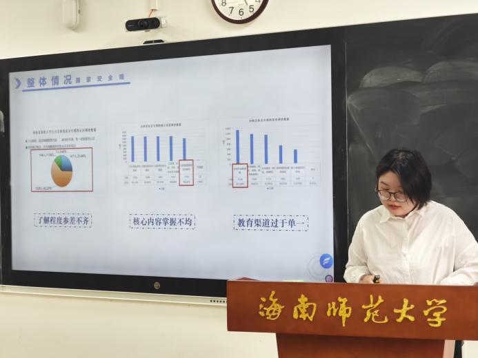在理论学习的基础上,活动进一步聚焦实践落地。紧随其后,青年马克思主义研究协会宣传部负责人谭凝馨同学以一线调研为依托,结合海南自贸港建设的时代背景,细致梳理高校大学生总体国家安全观教育的现状与现存短板,并就此提出兼具针对性与可行性的改进路径,为后续教育优化提供务实参考。